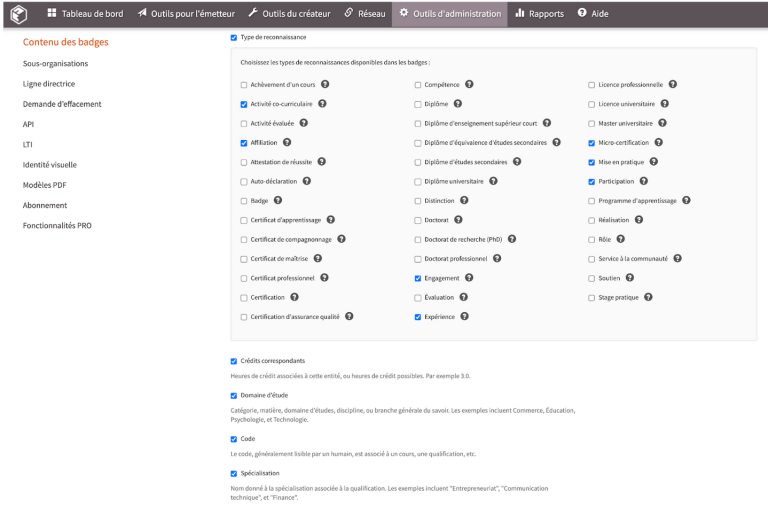 Tous les champs du standard Open Badges 3.0 ne sont pas forcément utiles à chaque organisation. C’est pourquoi Open Badge Factory permet aux administrateurs de choisir quels champs activer dans leur environnement.