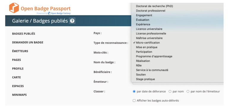 Par exemple, il est maintenant possible de rechercher dans Open Badge Passport tous les badges dont le type de reconnaissance est « micro-certification ».